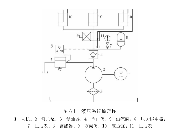 如圖6-1所示,當(dāng)需要夾緊工作時(shí),段及1啟動(dòng),液壓泵2開(kāi)始工作,壓力油一部分進(jìn)入夾緊油缸10,另一部分進(jìn)入蓄能器8儲(chǔ)存起來(lái)。隨著壓力的升高,當(dāng)達(dá)到系統(tǒng)使用壓力上限時(shí),壓力繼電器6發(fā)出信號(hào),通過(guò)電器控制使電機(jī)與液壓泵停止運(yùn)行,這時(shí)系統(tǒng)的壓力由蓄能器維持。隨著系統(tǒng)的漏泄,當(dāng)壓力降至壓力繼電器的下限時(shí),壓力繼電器又發(fā)出信號(hào),使電機(jī)與泵啟動(dòng),補(bǔ)充油壓。從液壓泵停止到再次啟動(dòng)的時(shí)間需根據(jù)系統(tǒng)中夾緊油缸的數(shù)量及系統(tǒng)的漏泄情況而定,根據(jù)經(jīng)驗(yàn),如果系統(tǒng)漏泄控制較好,其間隔時(shí)間可達(dá)2~3小時(shí)。這樣在很大程度上減少了電機(jī)與泵的運(yùn)行時(shí)間,使系統(tǒng)的發(fā)熱減少,各元件的壽命都會(huì)有所增加。