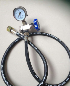 若蓄能器充氣壓力高時(shí),充氣系統(tǒng)應(yīng)裝有增壓器。此時(shí),將充氣工具的另一端與增壓器相連。